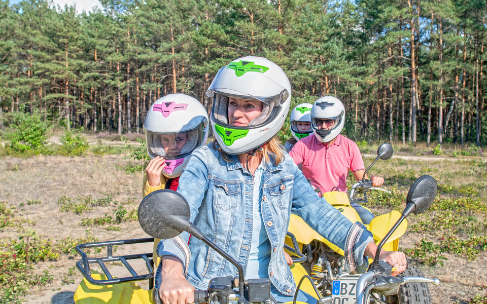 Am ehemaligen Tagebau über sandige Pisten düsen, durch Matschlöcher driften und spüren, wie die Jacke im Fahrtwind flattert: Das ist Offroad-Quadfahren im Lausitzer Seenland. Hier dürfen sogar Kinder ab sieben Jahren auf dem Beifahrersitz Platz nehmen und mit Mama oder Papa das Gelände erkunden. Das Quadcenter Klein Partwitz bietet auf Voranmeldung zweistündige Touren für Eltern mit Kindern an. Erfahrene Guides begleiten die Familien über Offroad-Gelände an den Seen zwischen Senftenberg, Hoyerswerda und Spremberg sowie um den aktiven Tagebau Welzow-Süd. Im Anschluss übernehmen die Jüngsten selbst das Steuer: Mit dem Kinderquad geht es für 20 Minuten auf den Rundkurs des Quadcenters.