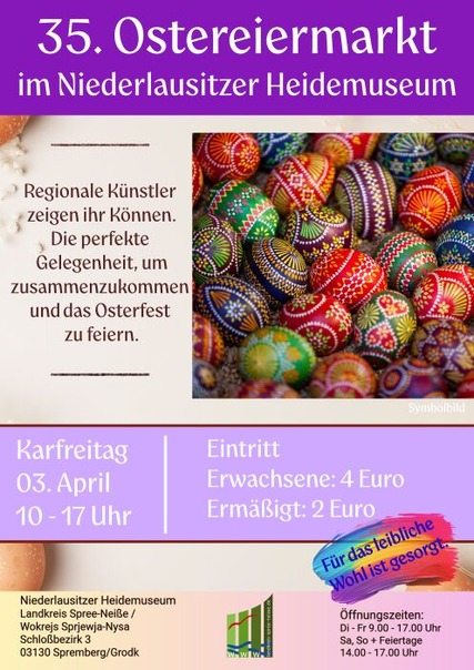 Der Ostereiermarkt im Niederlausitzer Heidemuseum Spremberg findet in diesem Jahr bereits zum 35. Mal statt. Erstmals wird der Ostereiermarkt durch einen Frühlingsmarkt ergänzt, der das Angebot um weitere saisonale Produkte, frühlingshafte Dekorationen und Osterschmuck erweitert. Wie schon in den vergangenen Jahren präsentieren zahlreiche Volkskünstler aus der gesamten Lausitz, teilweise in sorbischer/wendischer Tracht, im Festsaal ihr handwerkliches Können. Die Besucherinnen und Besucher haben die Möglichkeit, den Kunstschaffenden beim Verzieren der Ostereier über die Schulter zu schauen, mit ihnen ins Gespräch zu kommen oder die filigranen Arbeiten direkt vor Ort zu erwerben. Vorgeführt werden die für die Niederlausitz typischen Verziertechniken, darunter die Wachsreservetechnik, die Wachsbossiertechnik und die Kratztechnik. Die Vielzahl kunstvoll gestalteter Ostereier bietet ein eindrucksvolles Bild und spiegelt die kulturelle Identität der Lausitz wider. Auch für die jüngsten Gäste wird einiges geboten: In verschiedenen Bastel- und Kreativangeboten können sie sich selbst beim Bemalen und Verzieren von Ostereiern ausprobieren und österliche Geschenke anfertigen. Darüber hinaus ist auch für das leibliche Wohl gesorgt. Für alle Interessierte besteht zudem die Möglichkeit, die aktuelle Sonderausstellung "Zeit zum Feiern - Festkultur im Spree-Neiße-Kreis" zu besuchen, die noch bis zum 7. April 2026 im Museum zu sehen ist.