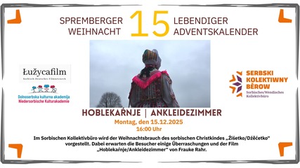 Gezeigt wird der Film **"Hoblekaŕnje/Ankleidezimmer" von Frauke Rahr**. Gedreht in Dörfern der Schleifer Region legt der 20-minütige Film den Fokus auf die Geschehnisse hinter den Kulissen des Weihnachtsbrauches und nimmt das Ankleiden des Dźěćetko unter die Lupe. Im Anschluss gibt es ein Gespräch zum Film und dem Brauch des "Źiśetko/Dźěćetko". Die Besucher sind zum geselligen Beisammensein und zum Austausch über die lebendige sorbische Kultur eingeladen.