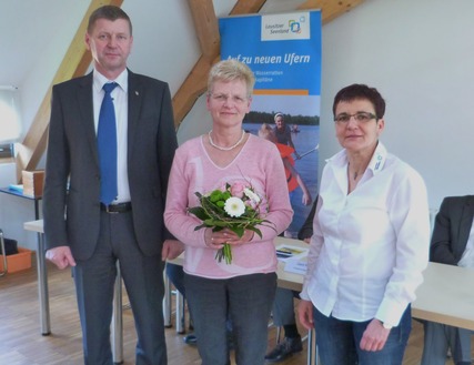 Bildunterschrift: Siegurd Heinze, Vorstandsvorsitzender des Tourismusverbandes Lausitzer Seenland e.V. und Kathrin Winkler, Geschäftsführerin des Tourismusverbandes Lausitzer Seenland e.V. (rechts) beglückwünschen Privatvermieterin Ursula Nittka (Mitte) aus Hohenbocka zur Reklassifizierung ihres Ferienhauses mit drei Sternen.